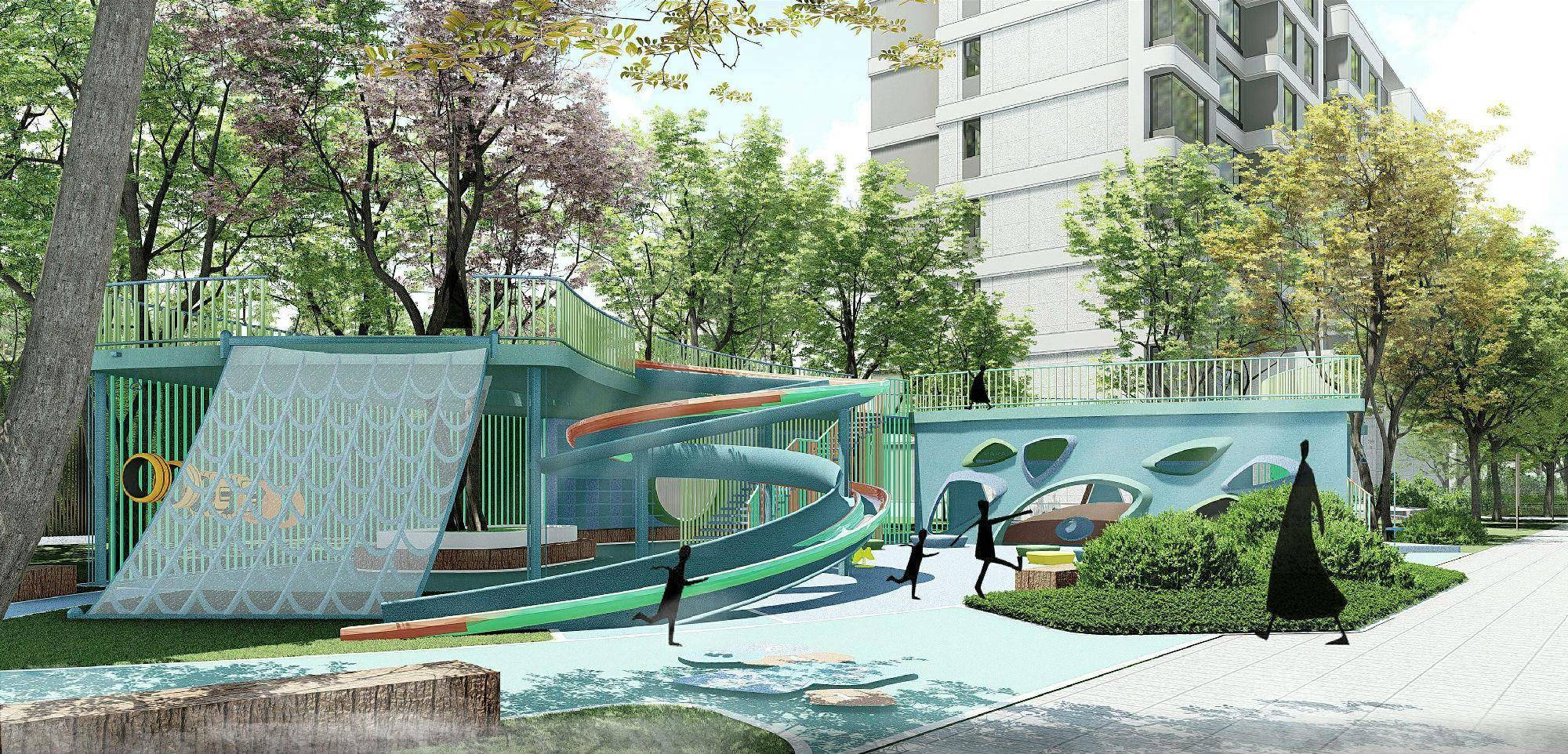 以此为主线串联起其他景观结构,诸如多功能活动区,实现了环道对全园功能的连接,同时增加了运动场地的立体维度。